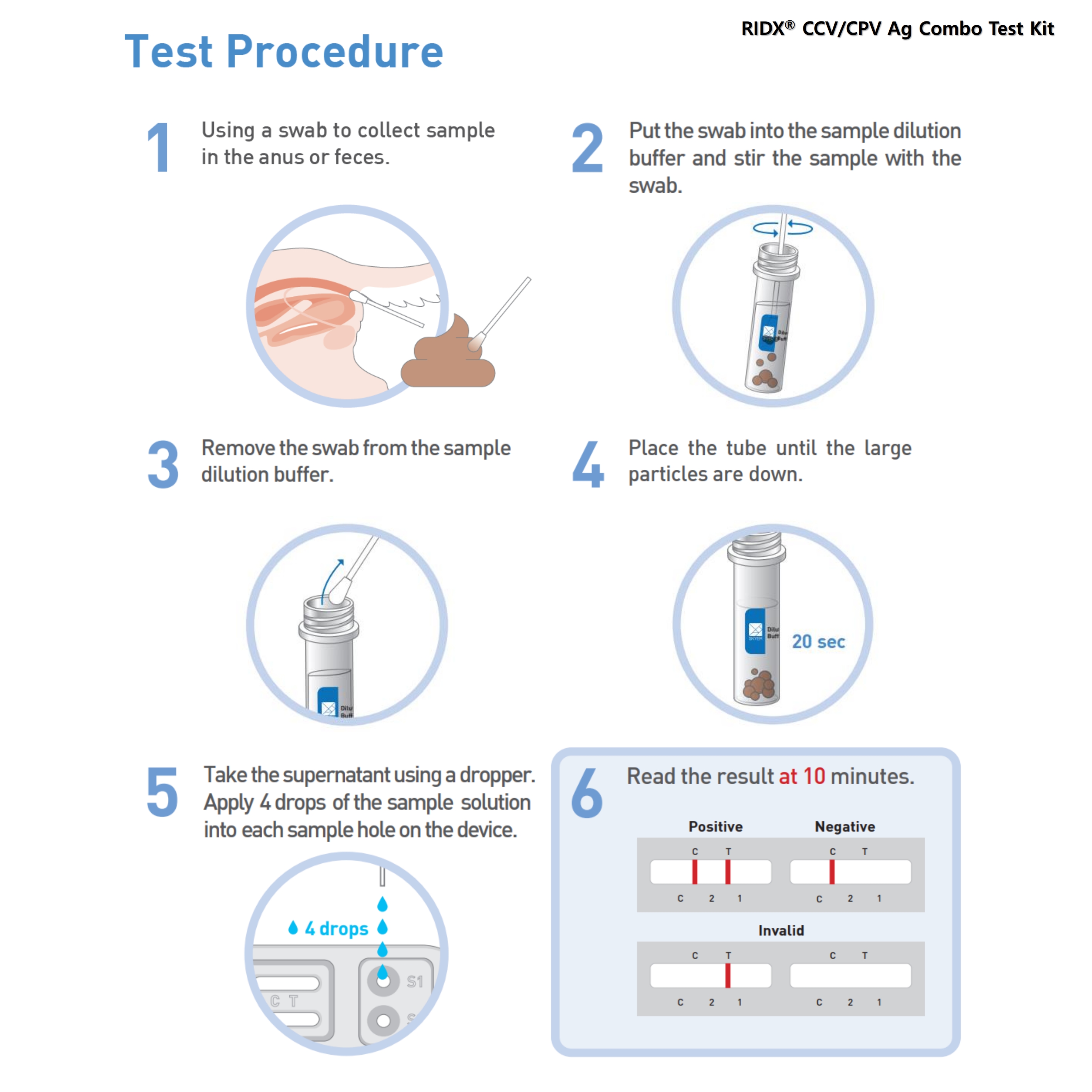 The highly selective and sensitive monoclonal antibody to CCV (or CPV) is used as capture and detector in the kit. The RIDX® CCV/CPV Ag Combo Test Kit can detect CCV antigens and CPV antigens in canine feces with high accuracy.