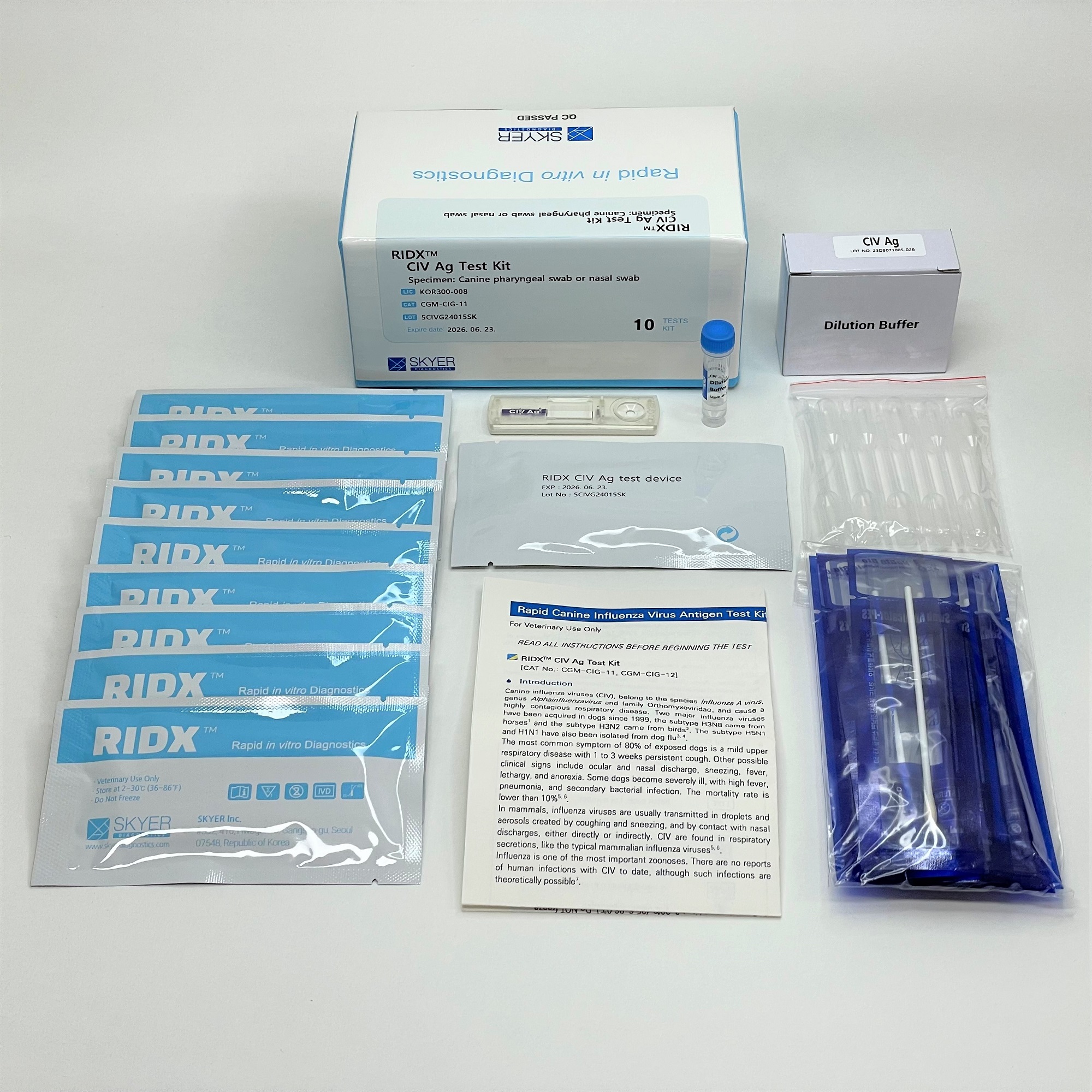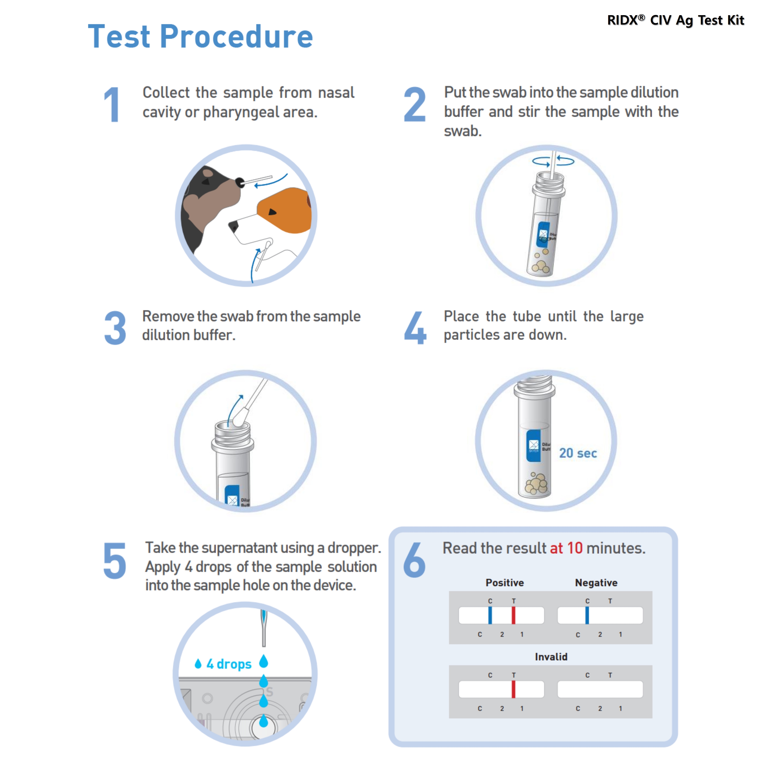 The RIDX® CIV Ag Test Kit is a lateral flow chromatographic immunoassay for the qualitative detection of canine influenza virus antigens in canine pharyngeal or nasal secretions. This kit shows two letters which are the test (T) line and the control (C) line on the surface of the device. If the CIV antigen exists in the sample, it binds to the cellulose nanobeads (CNB)-conjugated CIV antibody. The antigen-antibody complex moves through the membrane by capillary force and responds to the CIV antibody on the test line, resulting in a red line. The control line indicates that the test is performed correctly and should appear when the test is complete.