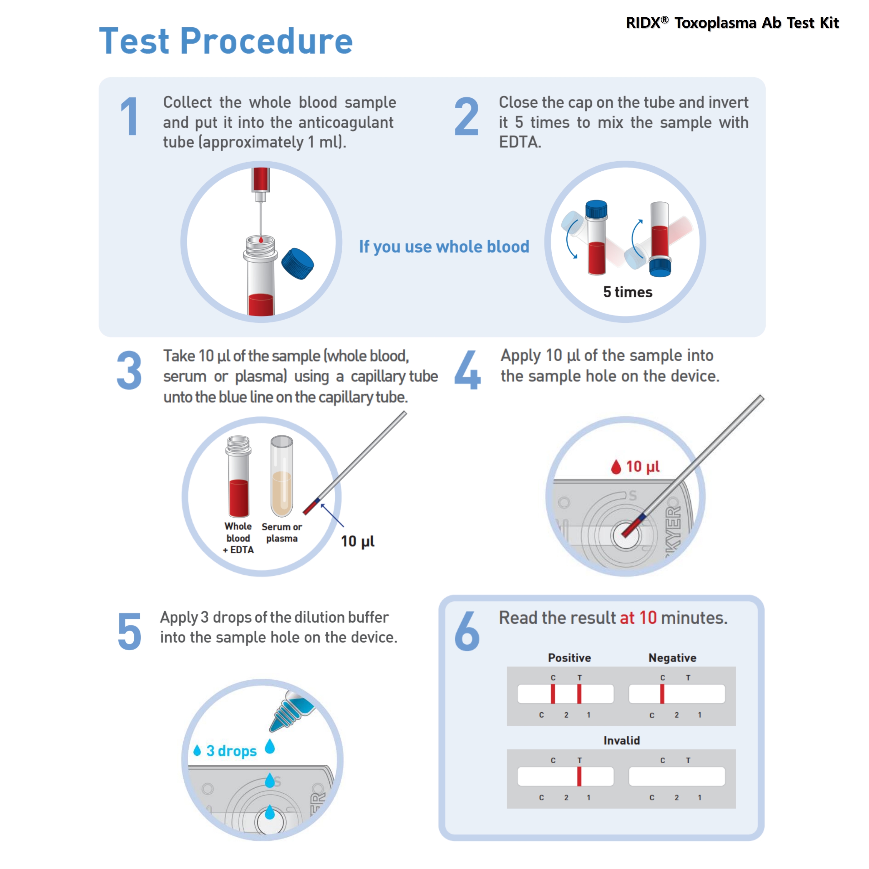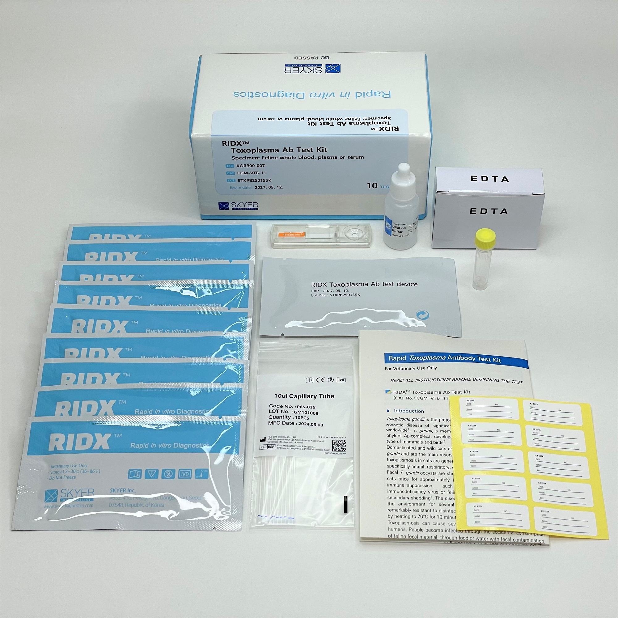 The RIDX® Toxoplasma Ab Test Kit is a lateral flow chromatographic immunoassay for the qualitative detection of Toxoplasma antibodies in feline blood. This kit shows two letters which are the test (T) line and the control (C) line on the surface of the device. If the Toxoplasma antibody exists in the sample, it binds to the gold-conjugated recombinant Toxoplasma antigen. The antibody-antigen complex moves through the membrane by capillary force and responds to the Toxoplasma antigen on the test line, resulting in a red line. The control line indicates that the test is performed correctly and should appear when the test is complete.
