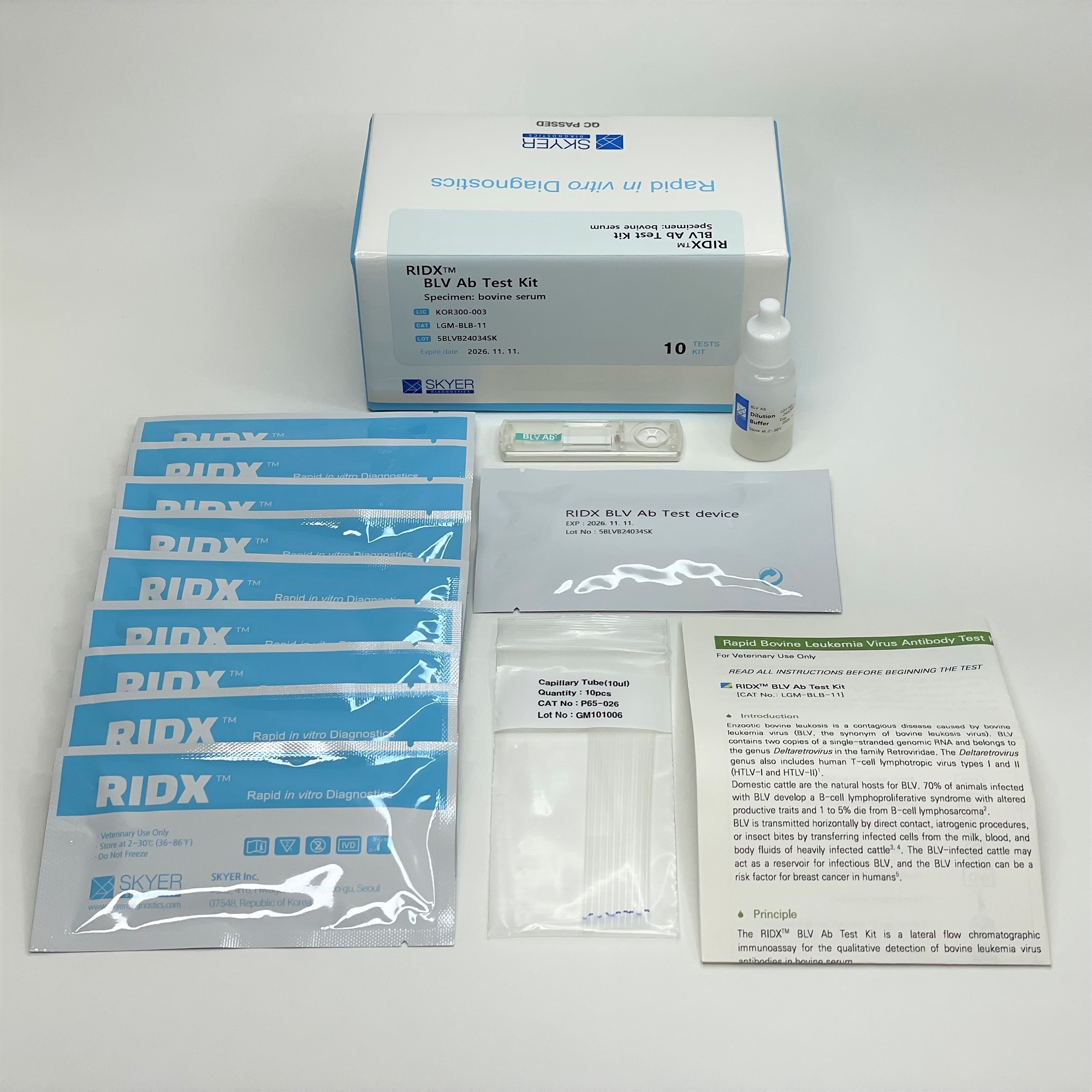 The RIDX® BLV Ab Test Kit is a lateral flow chromatographic immunoassay for the qualitative detection of bovine leukemia virus antibodies in bovine serum. This kit shows two letters which are the test (T) line and the control (C) line on the surface of the device. If the BLV antibody exists in the sample, it binds to the gold-conjugated BLV antigen. The antibody-antigen complex moves through the membrane by capillary force and responds to the BLV antigen on the test line, resulting in a red line. The control line indicates that the test is performed correctly and should appear when the test is complete.