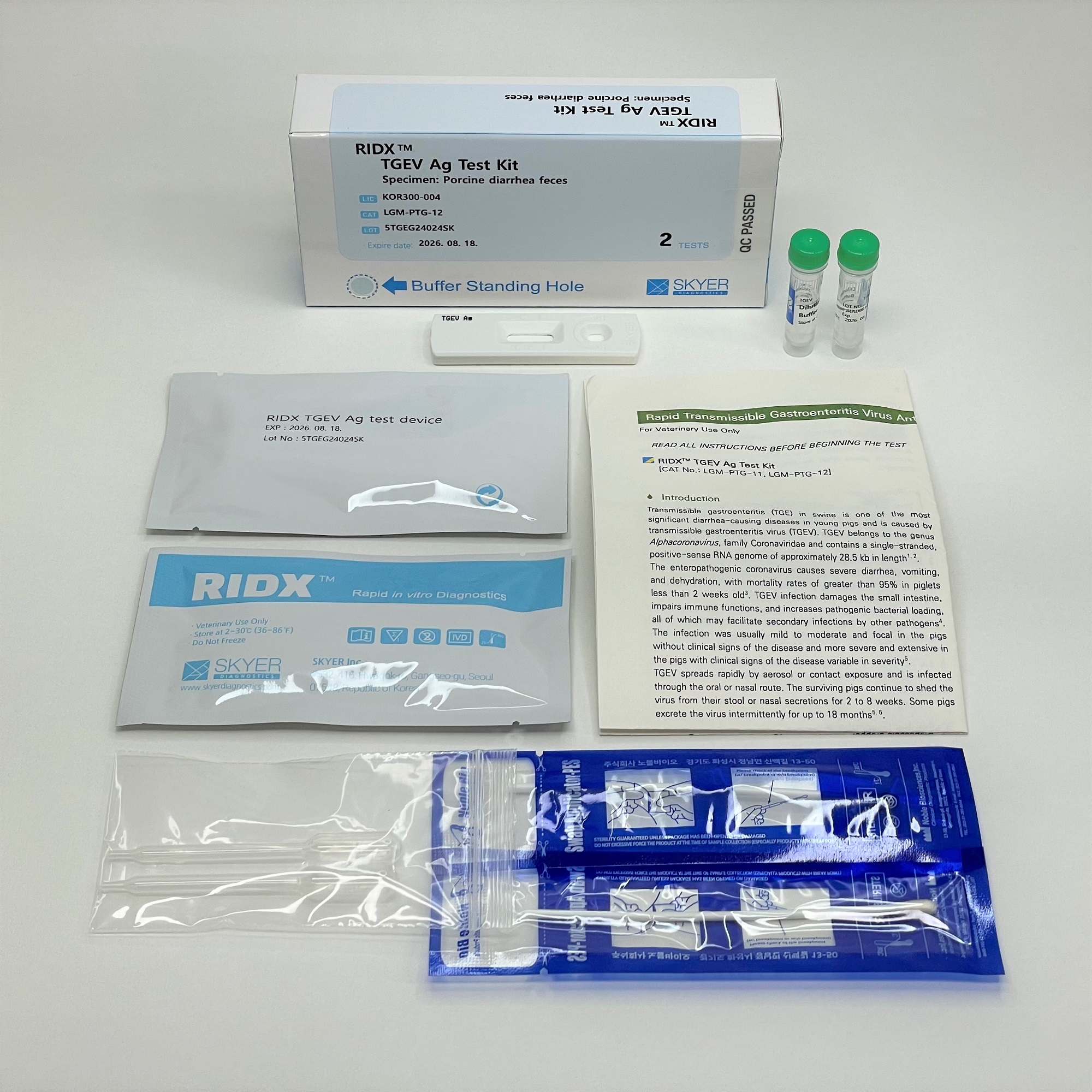 The RIDX® TGEV Ag Test Kit is a lateral flow chromatographic immunoassay for the qualitative detection of TGEV antigens in porcine feces. This kit shows two letters which are the test (T) line and the control (C) line on the surface of the device. If the TGEV antigen exists in the sample, it binds to the gold-conjugated TGEV monoclonal antibody. The antigen-antibody complex moves through the membrane by capillary force and responds to the TGEV monoclonal antibody on the test line, resulting in a red line. The control line indicates that the test is performed correctly and should appear when the test is complete.